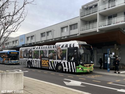Bus 597 is a Scania K320UB 4x2 (Euro VI) based at Belconnen Depot. It is currently in an all over advertising wrap for Jamala Wildlife Lodge / National Zoo & Aquarium.