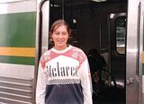 This is me jumping off a train in Melbourne 13 years ago. It appears to be a silver, white, green and yellow train.