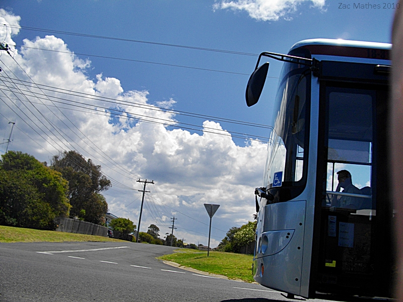 An accidental shot of the front of the bus at the corner of William st and Noble Parade in Dalmeny.