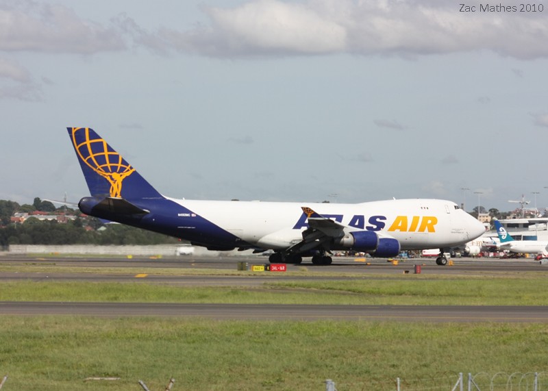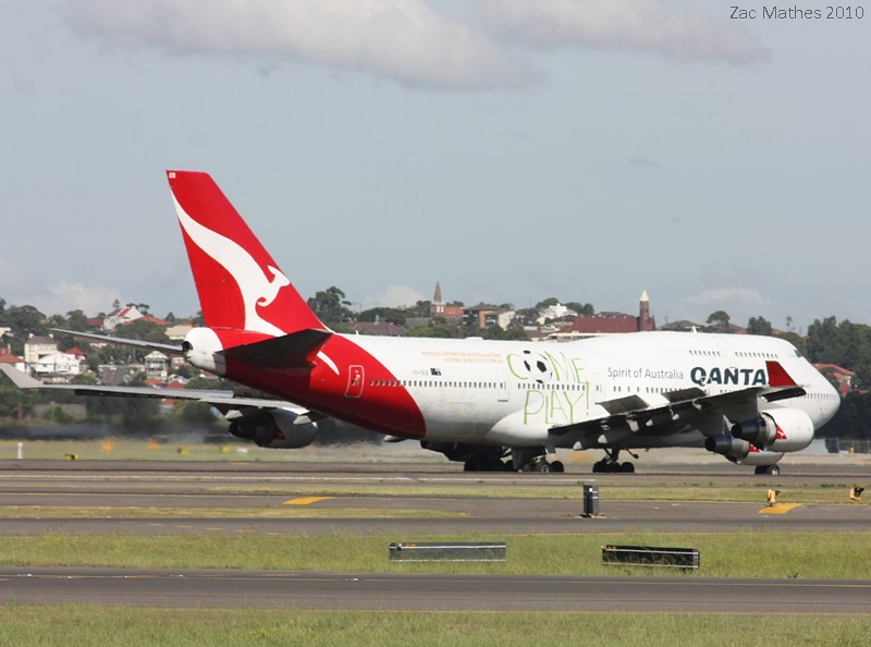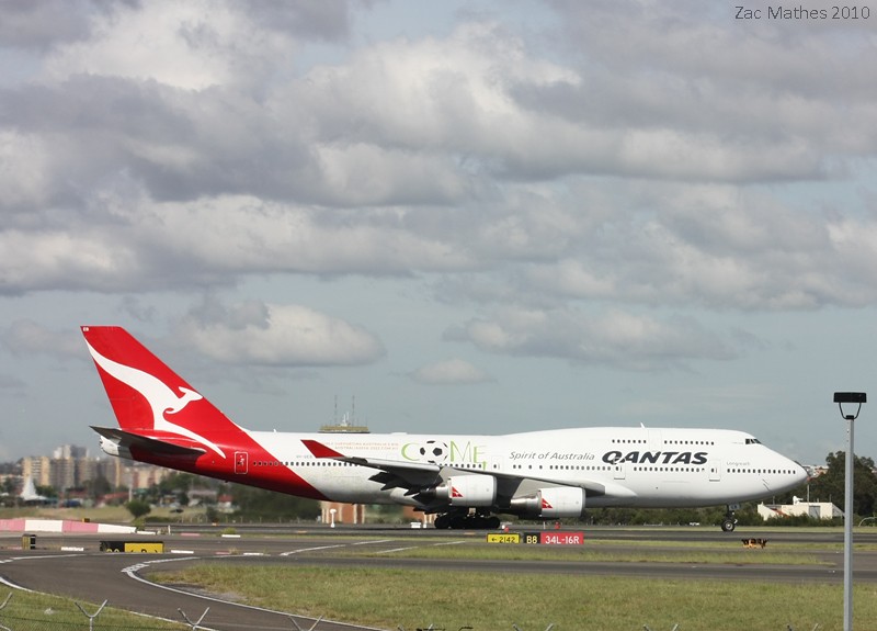 To start with, Qantas 747-400 VH-OEB is seen arriving on Runway 34L. This aircraft wears a special livery for the now failed world cup bid.