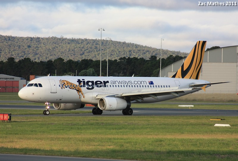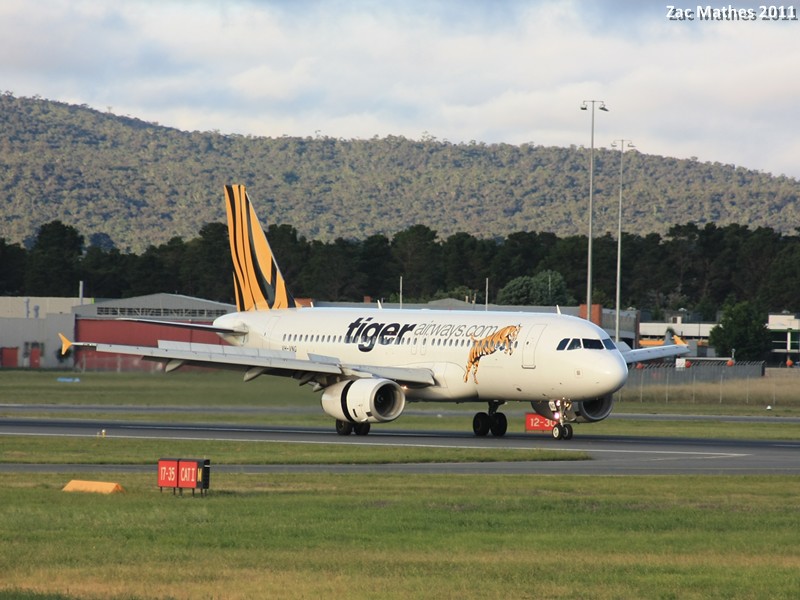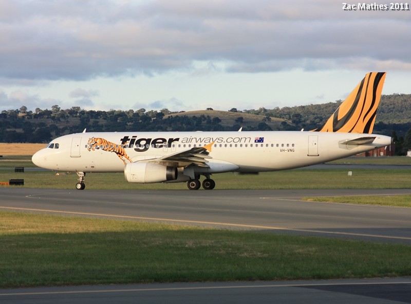 Tiger Airways Airbus A320-200 VH-VNG is seen in it's landing roll with full reverse thrust.