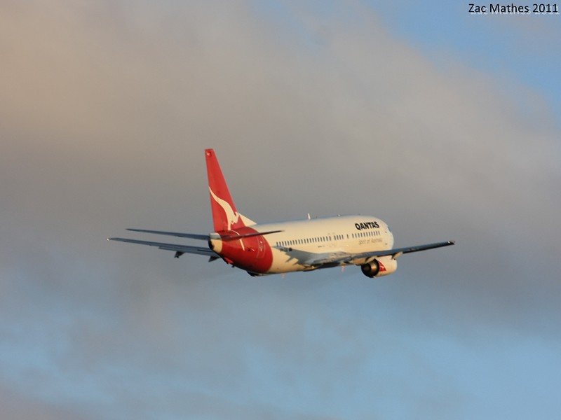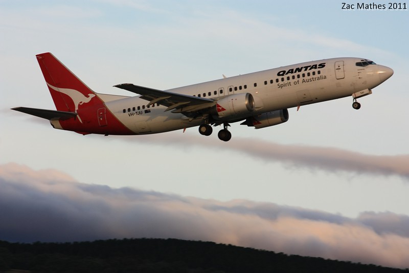 Qantas 737-400 VH-TJU 'Currawong' is seen climbing out for a flight to Brisbane.